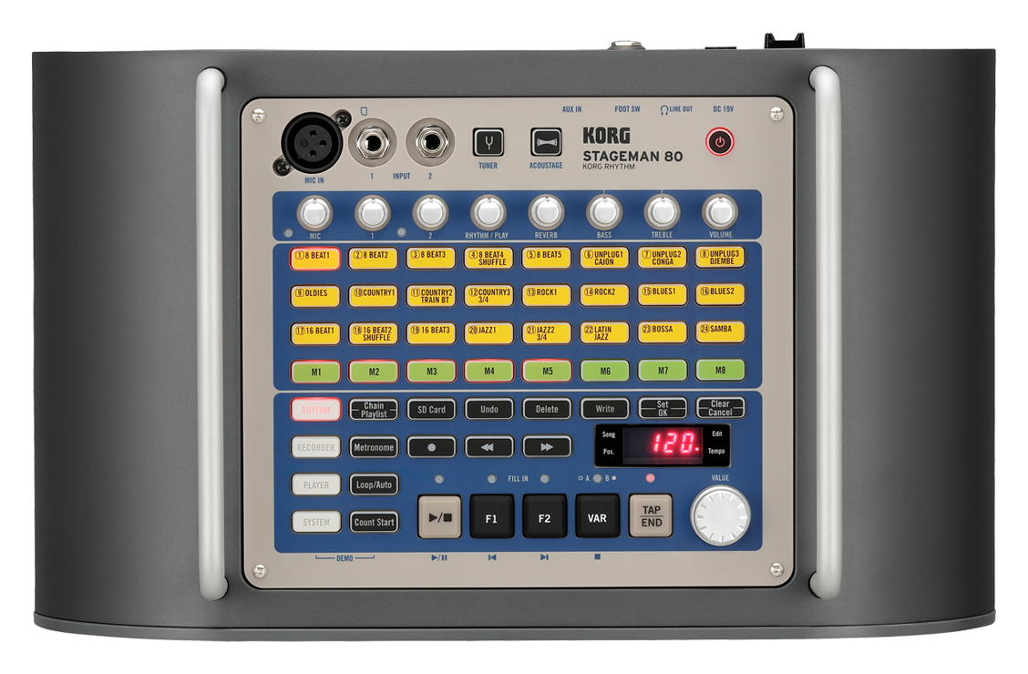 Você precisa de ritmos para suas performances solo? Você tem uma bateria eletrônica, mas você quer que suas performances pareçam mais "vivas"? O STAGEMAN 80 é um amplificador PA multifuncional que atende a estas necessidades. Este equipamento contém um grande número de padrões de ritmo de alta qualidade que podem até mesmo responder a modificações de andamento de maneiras realísticas, devido à nova tecnologia "Real Groove" da KORG®. O STAGEMAN 80 pode funcionar como seu baterista particular, para apóia-lo em suas performances ao vivo ou sessões de estudo. Você pode até mesmo criar estruturas rítmicas apropriadas para suas próprias músicas, usando um foot switch para controlar os padrões de ritmo em tempo real. Com falantes de alta qualidade e potência, o STAGEMAN 80 pode também ser usado como sistema de PA. Adicionalmente, a unidade oferece um gravador e player de áudio, assim como um mixer completo. O STAGEMAN 80 permite tocar com ótimo som e com os ritmos atuais.